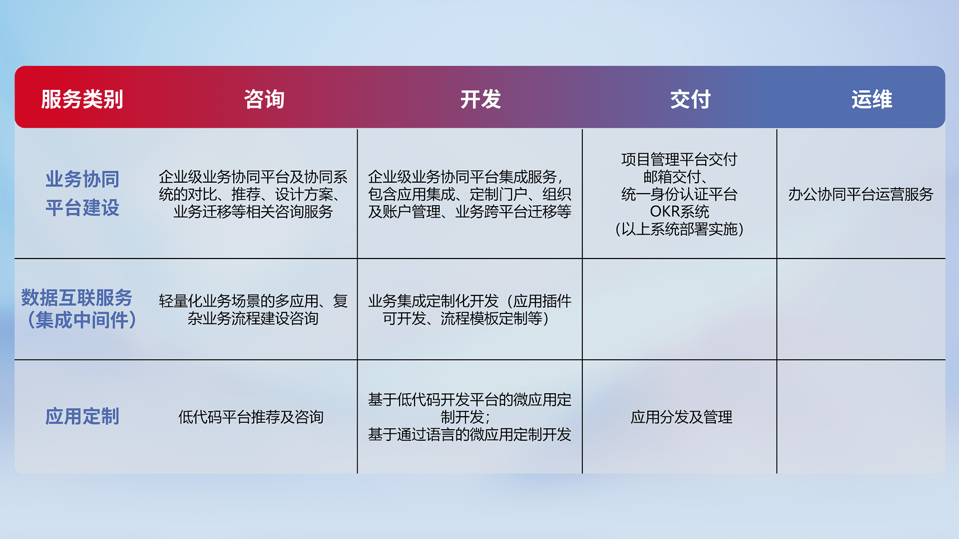 针对钉钉、、、企微、、、IDaas等平台级产品提供产品的规划、、、方案、、交付、、、、定制化开发等服务,,实现如统一协同办公、、、、智能客户服务、、、混合会议管理、、智能数据查询、、等业务场景,,实现数字化转型。。。。